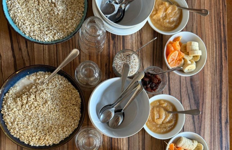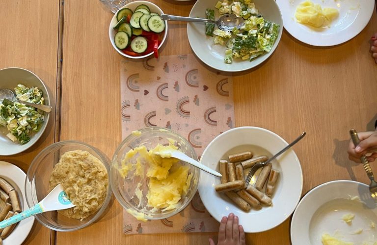Das Mittagessen findet in zwei Gruppen statt. Die Kinder dürfen sich dabei selbst auffüllen und können wählen, was sie essen möchten.